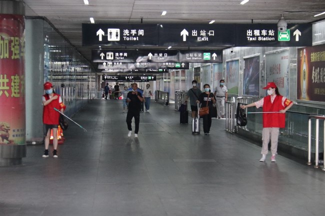 從落客平臺(tái)到公交車站再到中央廣場,志愿者們辛苦撿拾每一個(gè)煙頭,耐心解答每一次問詢,勸阻亂扔垃圾、隨地吐痰等不文明行為,為創(chuàng)城工作做出了自己的貢獻(xiàn)。